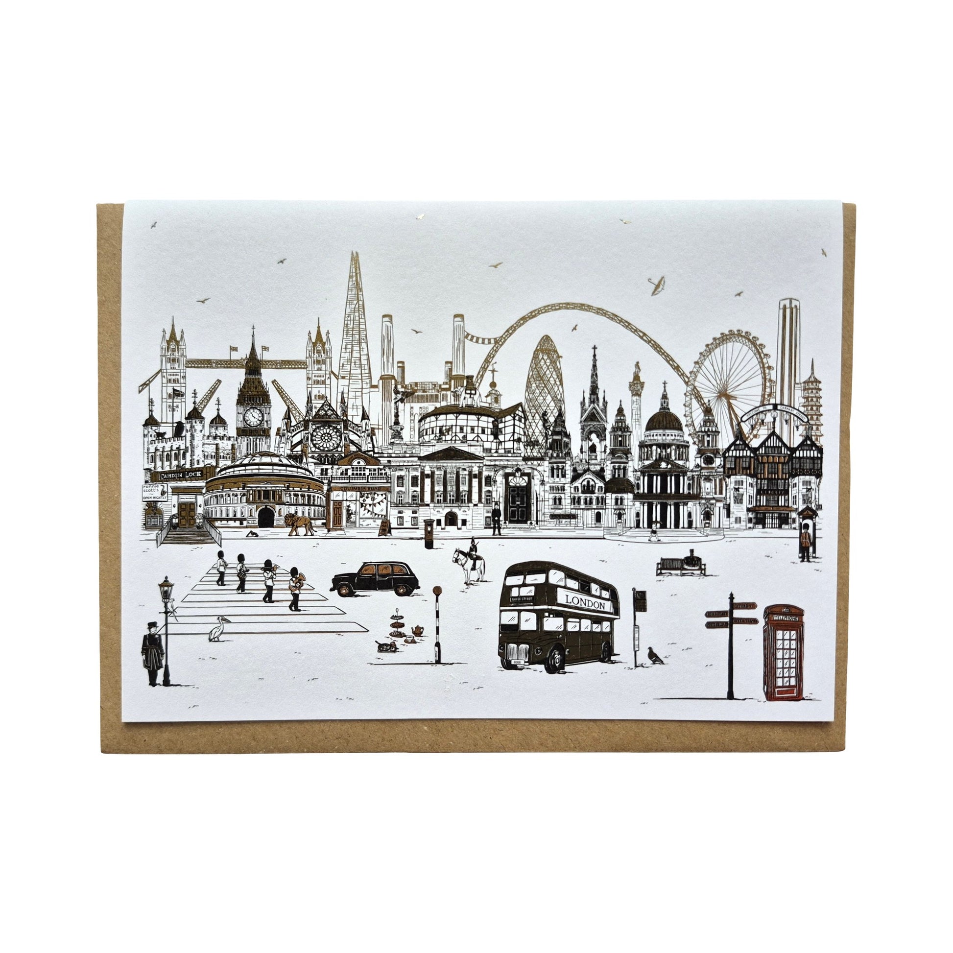 This sparkling London Greetings Card with its highly detailed golden illustrations makes a wonderful gift for sending someone you love a thoughtful message or display in your home as a nostalgic reminder of your time in London.